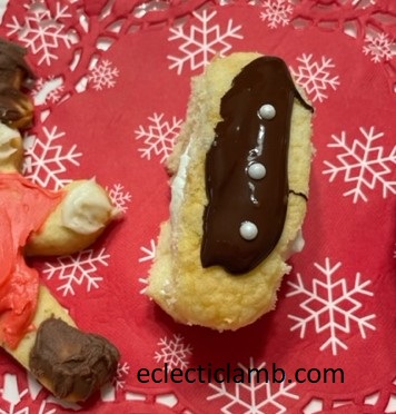 Cheats Eclairs with decorations to look like pipes. I made these shortly before serving.