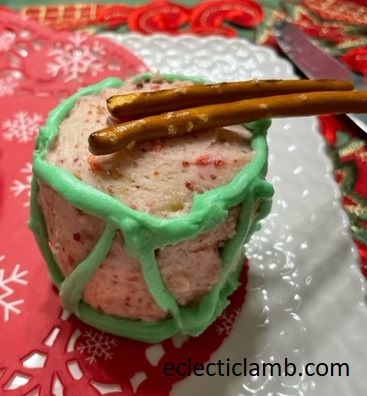 Pound Cake Drums frosted with Strawberry Frosting, pretzel sticks. I used strawberry frosting since we loved it at my Tea Party. I struggled with frosting these. They looked like shag carpet. My Mom saved the day with a tip from her Mom (she died years ago). After setting the butter frosting in the refrigerator, she used a knife dipped in warm water to smooth the frosting.
