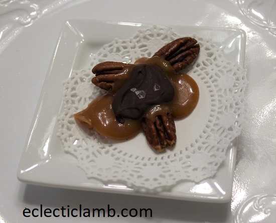 Chocolate Turtles– I used Werther’s Chewy Caramels and Wegmans Cyprus Sea Salt flakes. Delicious! We made them a day ahead. They stuck to the parchment so we put them in the freezer. I thought that they were difficult to eat but my guests had no problem with them.