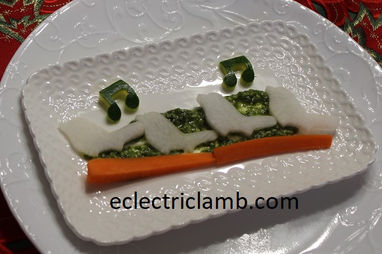 Vegetable Food Art – Daikon birds cut with a cookie cutter, zucchini musical notes cut with a mini cutter, carrot sticks. Served on homemade pesto that I made a week before and put in my freezer. This was a refreshing and delicious course!