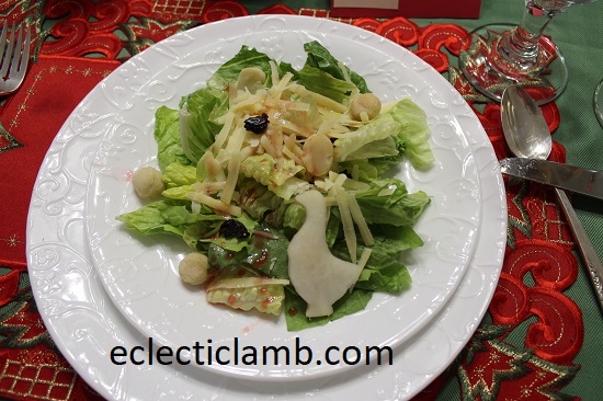 Romaine Macadamia Salad with Cranberry Vinaigrette – (click on print to see the entire recipe). I couldn’t find frozen cranberry concentrate. I used unsweetened cranberry juice with maple syrup in the vinaigrette. I used whole macadamia nuts for the “eggs”. I shredded Irish Cheddar for the salads.