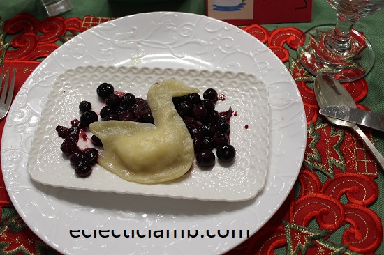Swans – Homemade Ravioli cut with a cookie cutter. I used this dough and filled with a mixture of Ricotta, Parmesan, and Asiago cheeses. I made the swans a week ahead and put in my freezer.