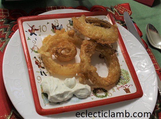 Onion Rings – my Dad made his onion rings. Served with Ranch dip made with Hidden Valley Ranch packet and sour cream.