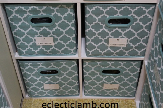 I used my old Brother P-Touch labeler to create labels for the cubes. I made a guide for myself and posted it in the closet. I also have a spreadsheet with all the different separate categories in each cube. For example, Spring Holiday has Hearts, Cupid, Leprechaun, Pot of Gold, Shamrock, Easter / Eggs and Crosses.