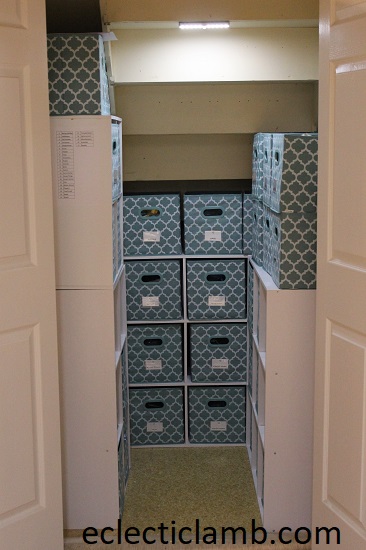 Cube Shelves – I used one ClosetMaid 9 cube, two 6 cubes, and one One-Space 4 cube shelf. I bought them from Lowes and Amazon. My Dad put them together. He also installed a battery operated motion sensor light.