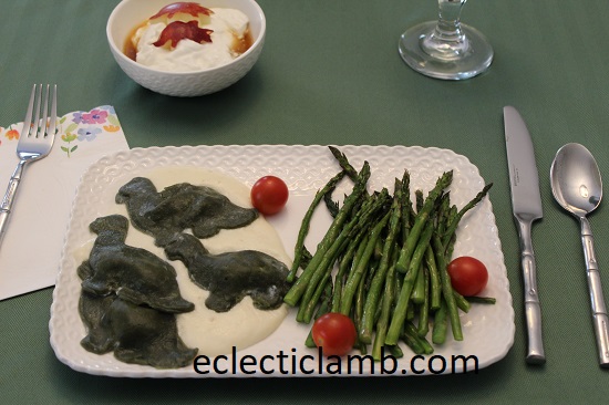 I enjoyed this meal with my friend Renae. When I was a kid, I drew sheep. Renae drew dinosaurs. I thought it was fun to make dinosaur ravioli. I made and froze the ravioli several weeks before the meal. It became a somewhat quick workday lunch. I was happy that she was able to come over and join me for lunch.