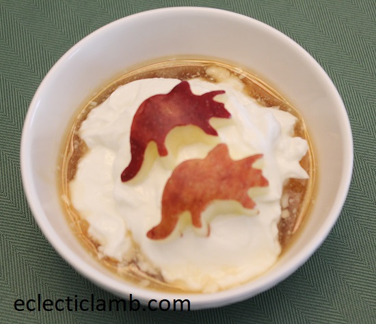 Dino Dessert – Apple cut with a cookie cutter, plain Greek yogurt, maple syrup