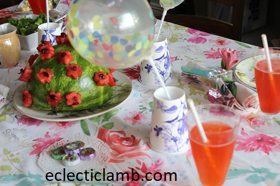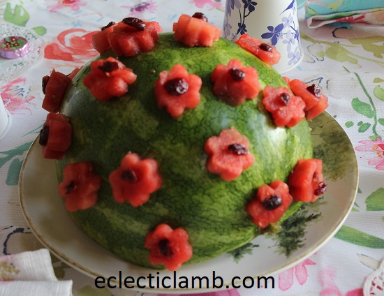 Watermelon Flower Centerpiece: My Dad and I made the watermelon centerpiece. We cut watermelon with a flower cookie cutter, attached with toothpicks and added dried cherry centers.