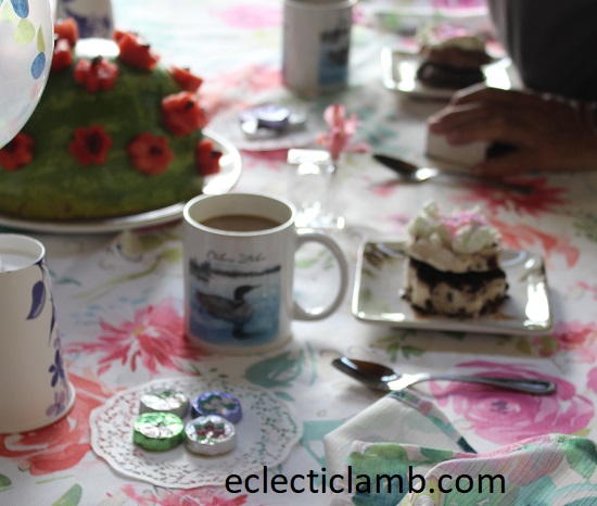 - Individual Flower Shaped Ice Cream Cakes – cut chocolate or non-chocolate ice cream with flower cookie cutter, put in freezer, added gummy bears or crushed mint chocolate cookies in the middle, another flower shaped ice cream, whipped cream and sanding sugar on top.