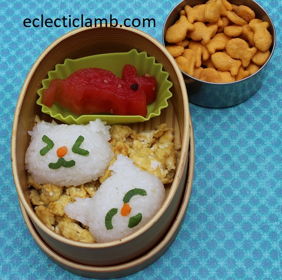 Cats: Cooked Nishiki rice shaped with a rice mold, eyes & mouth – spinach cut with rice mold set, nose – carrot