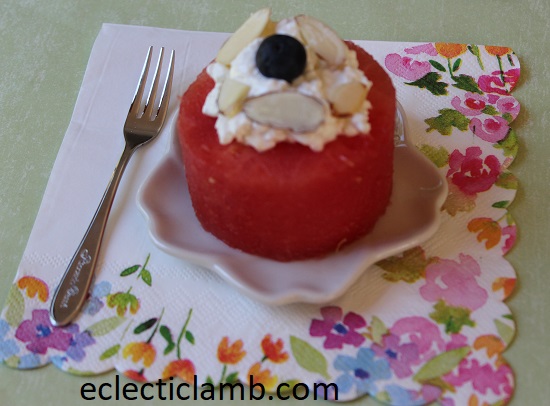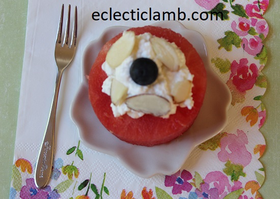 I used a round ring for stacking food. Then, I topped it with cottage cheese, sliced almonds and a blueberry. I was inspired by this but I used cottage cheese instead of whipped cream.