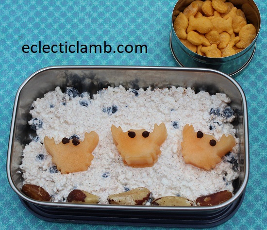 Contents: Crabs – cantaloupe cut with a cookie cutter Eyes – mini chocolate chips, cottage cheese, cinnamon, blueberries, brazil nuts