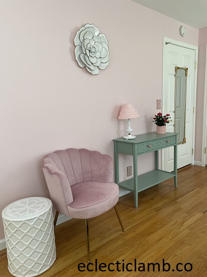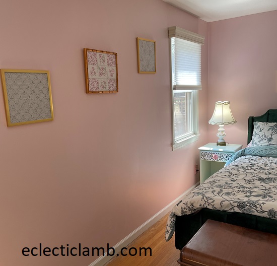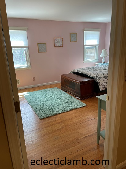 Here is my Pink and Green bedroom with gold accents. When planning this room before I moved into the house, I knew I wanted pink walls as I had in my childhood bedroom. This pink is deliberately softer than the shade I had as a kid. This is my first time to live in a house by myself vs an apartment with limited decorating possibilities. Sometimes decorating is more difficult when I only have myself to answer to. I am happy that my parents and I removed the carpet that was previously in the house.