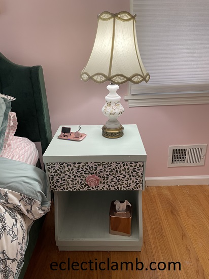 Right Night Stand: From my childhood bedroom. It didn’t used to have a back. My Dad made a back this time. Painted it a soft green. Decoupaged the drawers. Added flower knobs, Lined the drawer with same paper I used to decoupage the outside.