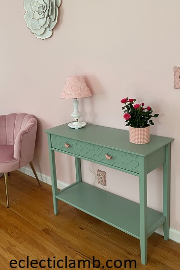 Console Table: This in mint green. My Dad assembled it and added these bird knobs.