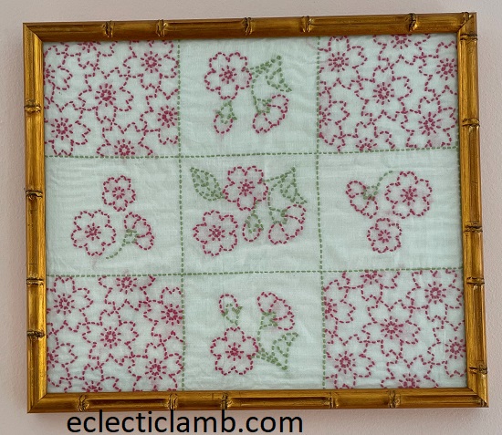 Sashiko Art: I stitched these from patterns I bought in Japan. The center one has a Bamboo picture frame.