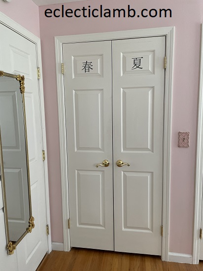 Closet Labels: I like that my room has 3 distinct closets. I have one for Spring / Summer, one for Fall / Winter and one for miscellaneous. I sent the Japanese characters to my friend’s daughter Elizabeth and she formatted them for me. We printed them together on my Cricut machine. Elizabeth installed these on my closet doors. My Dad did extensive work getting these closets ready for me.