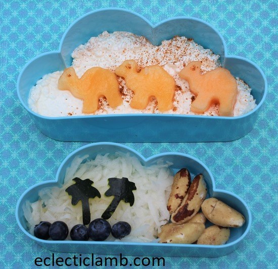 Large Box: Camels – cantaloupe cut with cookie cutters, Eyes – cinnamon, cottage cheese with cinnamon, blueberries underneath