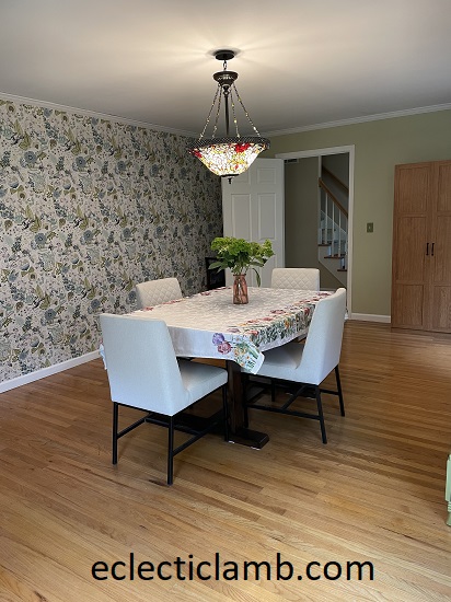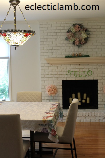 This is my dining room. I am calling it “whimsical” since I am not sure what else to call it. It took longer to reveal it here than some of my other rooms since I had to wait for the mantel installation. It took the installers only 40 minutes but I had to wait 5 months. I am glad that the mantel is now in it’s proper place and not on the floor. I think the people in my life are happy to no longer hear me complain about the mantel. Installation day was exciting! The photos here show my summer decorating. I expect the decorations to change with the seasons / holidays. I also expect this room to frequently be featured here as the backdrop for meals.