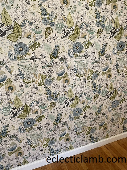 Wallpaper: Whimsy Fauna. I bought it online from Home Depot in the green colorway. A different colorway is sold by Anthropologie. It took me a long time to find wallpaper I liked for this room. I am very happy with my selection. My wonderful parents installed the wallpaper.