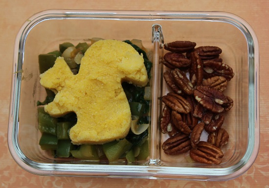 Left Side: Squirrel – homemade firm polenta cut with a cookie cutter, Polenta with Spinach and White Beans