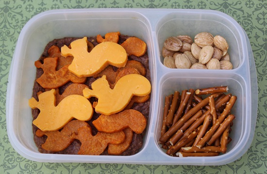 Left Side: Squirrels – sweet potato cut with a cookie cutter and roasted, orange Cheddar cut with a cookie cutter, black bean sauce – black beans, salsa, balsamic vinegar blended in a food processor
