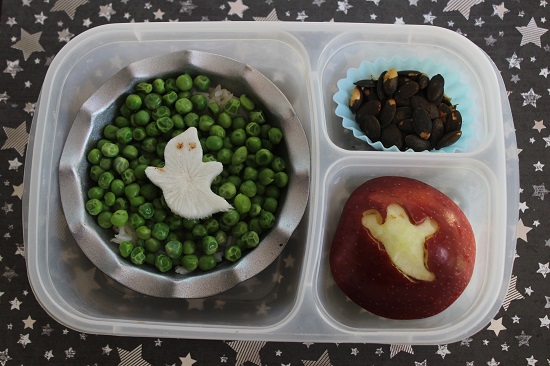 Left Side: Ghost – Radish cut with a cookie cutter, Eyes – paprika, peas, cheddar cheese, rice