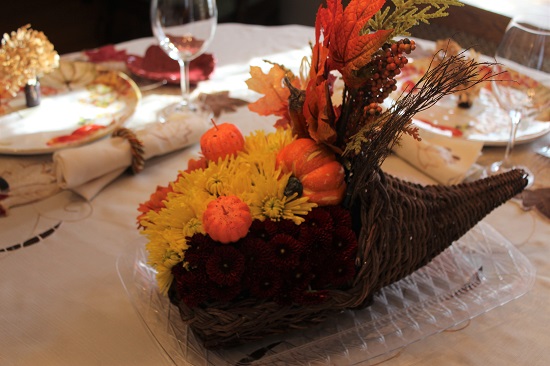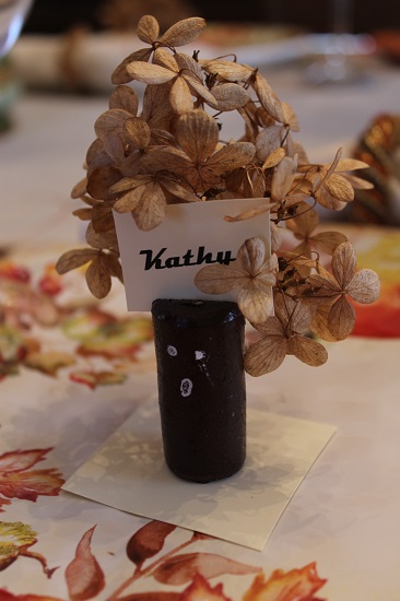 My parents did a wonderful job with all the preparations. My Mom made the Cornucopia flower arrangement. Also her turkey cork place cards were a hit! She painted the corks, printed the names, and added tree hydrangeas from her garden. They used a white pen to draw on the features. They glued the corks to little pieces of cardstock to make the turkey’s stand up.