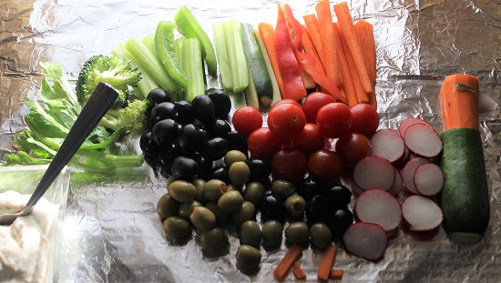 Appetizers: Vegetable and olive turkey with celery, broccoli, carrot, cherry tomato, black olives, green olives, radish, cucumber and ranch dip