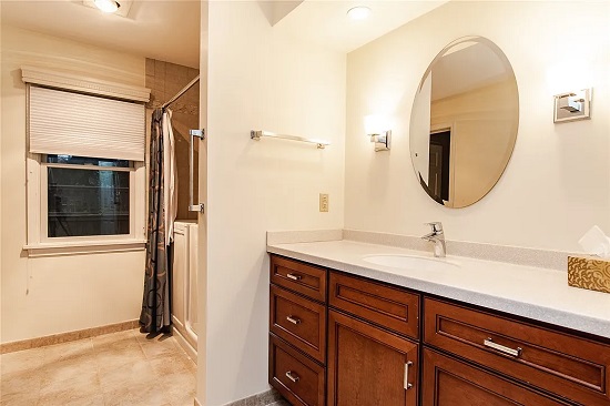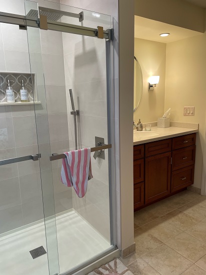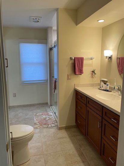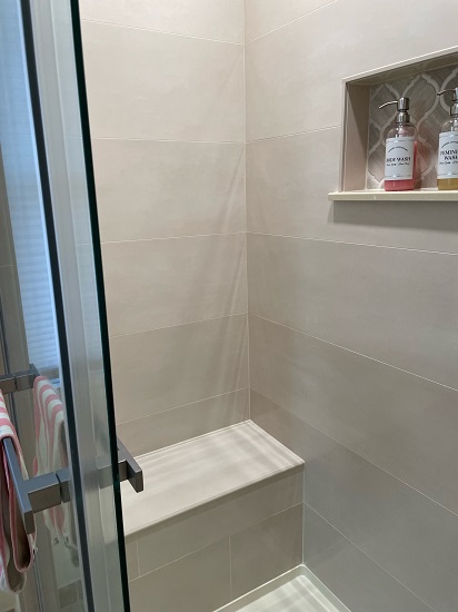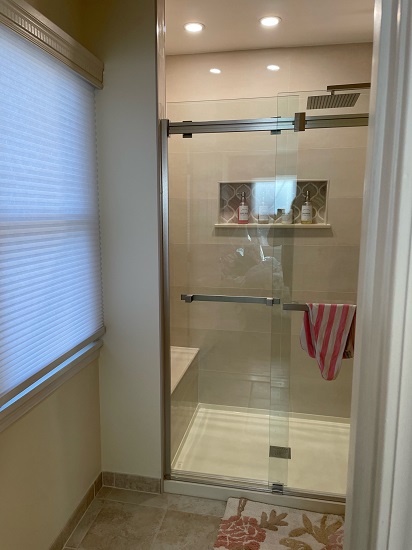 This is the bathroom attached to my bedroom. It took time to share here since I had to hire contractors to remove the walk in tub that came with the house and build a walk in shower. The walk in tub was dangerous for me to get out. I love my new shower, bench, and niche. Falcon Renovations did a wonderful job! The only other changes I made to this room are functional / decorative pieces.