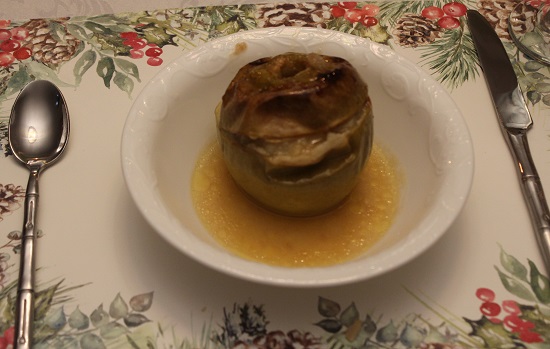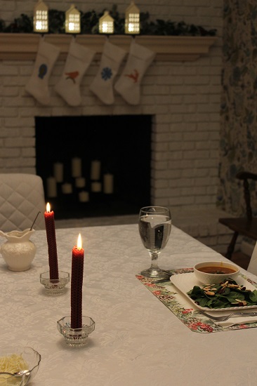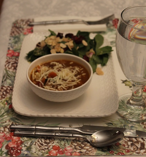 Everything was delicious. I like eating lentil soup since it makes me feel like I am taking good care of myself with a nutritious soup. This one was especially good with the sundried tomatoes and my addition of Asiago cheese. The spinach salad was simple but made special with the crunchy almonds and sesame seed vinaigrette. The apple dessert was tasty and had an amazing sauce! My dining room this time of year with my Christmas tree and other lights makes it very cozy to dine in the evening.