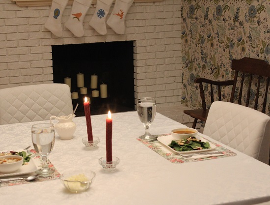 My friend Caroline Korn came over for dinner. When I asked her for theme/food requests she texted, “USA and salad/soup.” I was not sure what to do with the USA part since there are not many American vegetarian soups. I could have done a patriotic theme but then I would not want to post for awhile and I enjoy highlighting my Christmas dining room with stockings. I decided to focus on the salad/soup suggestion. I think this is my first time doing salad and soup. Usually I do soup and bread dinners. Caroline made the dessert. Afterwards I found out that the USA was autocorrected and it was supposed to be “Pizza”. I am looking forward to make pizza another time to add to my collection. Regardless, I enjoy receiving requests from my dinner guests, it inspires me to try new things.
