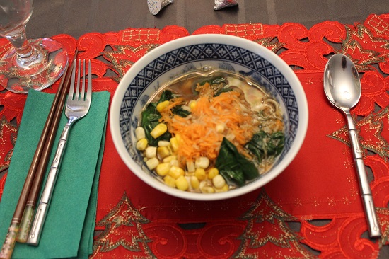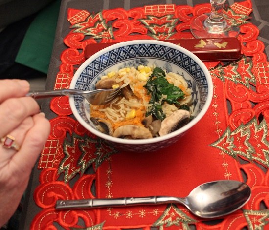 On New Years Day, my niece made homemade ramen. She did most of the work. I only helped with the broth, some toppings and prepared the dessert. Five of us enjoyed the delicious ramen with toppings (my friend Carol joined us). We reused some table decorations from the night before. It was an extraordinary start to the new year!