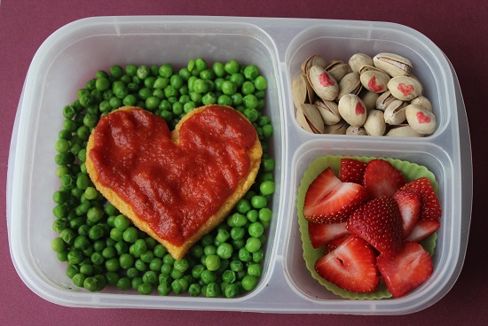 Left Side: Heart – homemade polenta cut with a cookie cutter, tomato sauce, peas