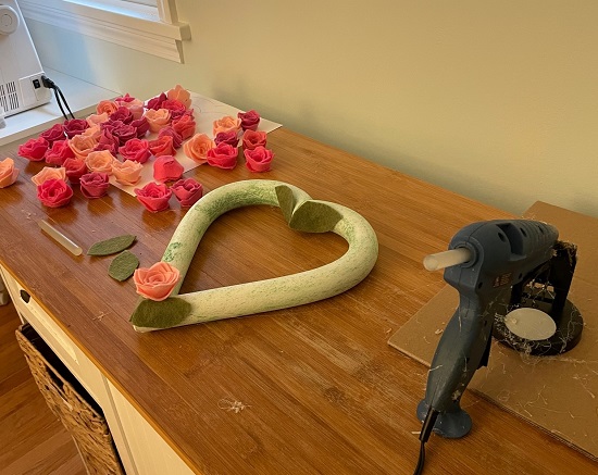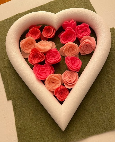Felt Rose Wreath – I used this template but cut by hand. I used three different shades of pink, cut leaves out of green felt, the heart wreath form was from Hobby Lobby. I used a lot of hot glue for this project and of course burned myself a little as is common when I use my hot glue gun.