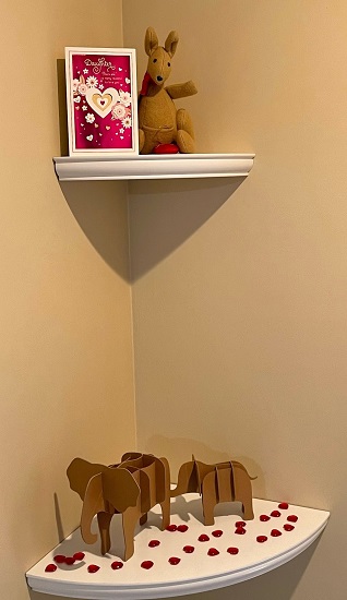 Bottom Shelf: Wooden elephants cut with my Cricut machine. My 20 year old niece styled the elephants. I added some hearts for the season.