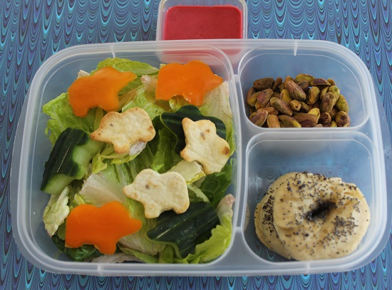 Left Side: Elephants – Bell pepper and cucumber cut with a cookie cutter, romaine, Tortilla chips – cut flour tortilla with cookie cutter, brush with olive oil, sprinkled with salt – bake in 375 over for about 10 minutes,