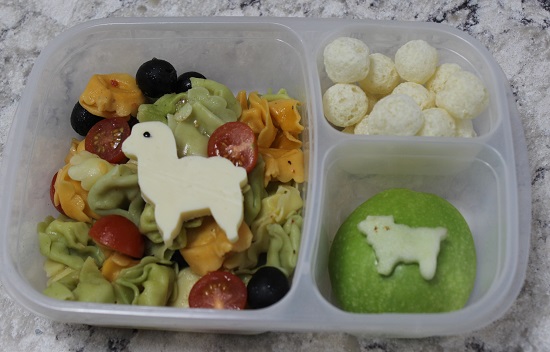 Left Side: Sheep – cheddar cheese (cut with a cookie cutter), food marker detail, cheese tortellini with Italian dressing, cucumber, cherry tomatoes, black olive