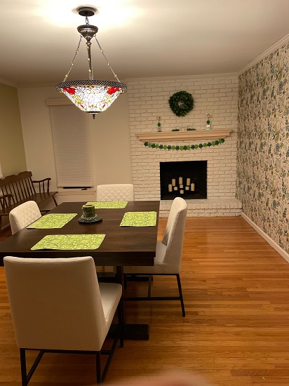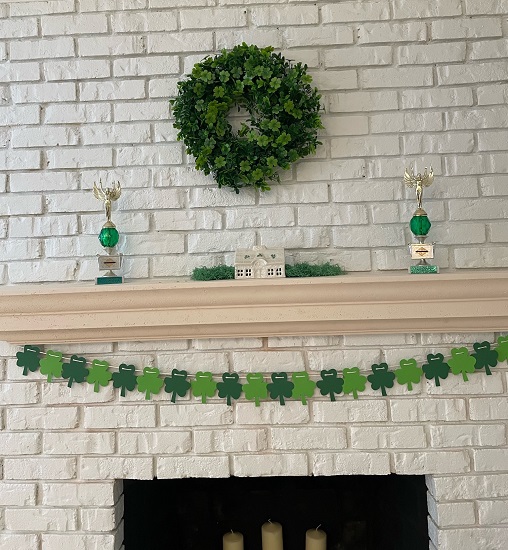 Dining Room: This is the first March that I decorated my Dining Room. I bought the shamrock wreath from Walmart online but I can’t find the same one to link. I made the simple Shamrock garland with paper, hole punch, and string. The trophies are from my youth Irish Step Dancing days. I received the Belleek Irish Cottage tea light holder in 2004.