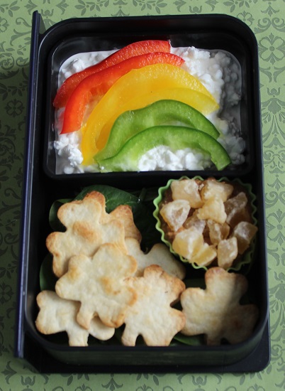 Contents: Rainbow – Red, Yellow, Green bell pepper, cottage cheese, Shamrocks – Tortilla chips cut with a cookie cutter, brushed with olive oil, bake in 375 over for about 10 minutes. Pot of Gold – Peanut butter, graham cracker crumbs, and non-fat milk powder, dried pineapple