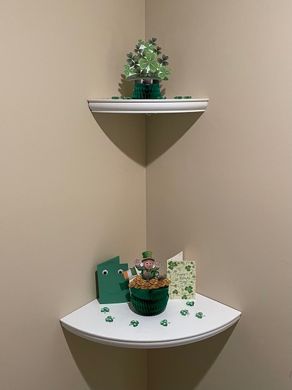 Hallway Floating Shelves: St. Patrick themed honeycomb decorations, plastic shamrocks (from Dollar Tree years ago), cards from my 20 year old niece and Mom.