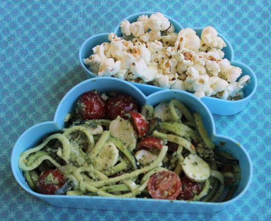 I made this for lunch when my parents were visiting. We all ate it but I put this portion in the cloud boxes. If you make if for a packed lunch, I recommend packing the pesto dressing for the zucchini noodles separate and mix before serving. It was a fun way to eat zucchini noodles!