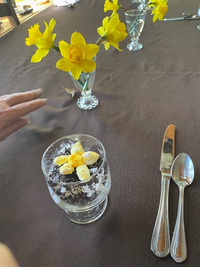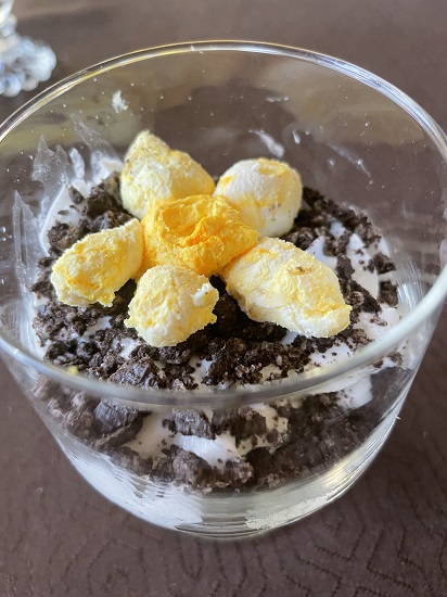 Daffodil Parfait: Daffodil – cream cheese with food coloring, Dirt – crushed Oreo thins cookies, Whipped Cream
