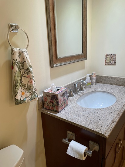 This is my first time to live in a house with a basement bathroom. One of my Grandparent’s houses had a basement bathroom when I was a kid. It was next to the bar. My basement bathroom is adjacent to my movie room. I did not do much to decorate this room. My Dad installed a new toilet paper holder since the previous was broken and he changed the ceiling light bulbs. Other than buying a few things, the biggest project in this room was to decoupage the switch and outlet plates.