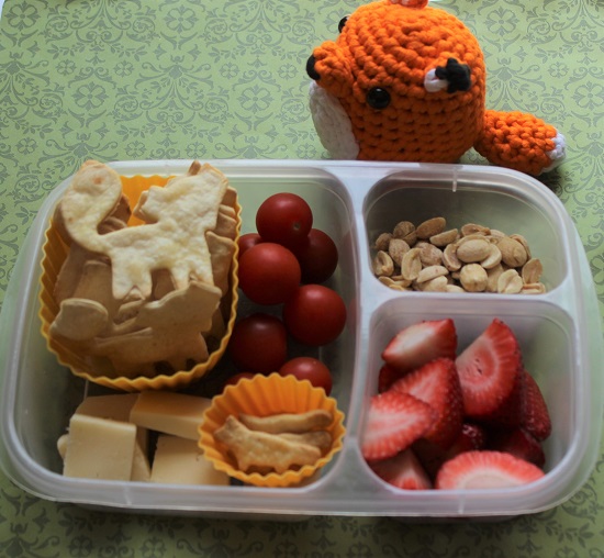 I made this snack meal for Elizabeth on a day that she helped me install a lot of home decor decals. Recently she crocheted this cute fox for me so I made a fox themed meal.