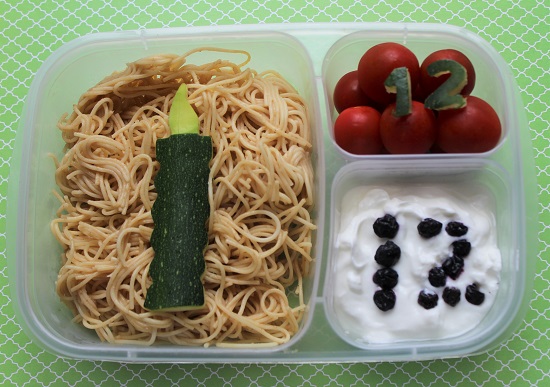 Left Side: Candle – Zucchini cut with a cookie cutter, removed the skin from the flame portion, peanut noodles