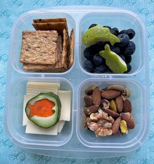 - Fish – carrot cut with a cookie cutter, cucumber, Cheddar cheese
