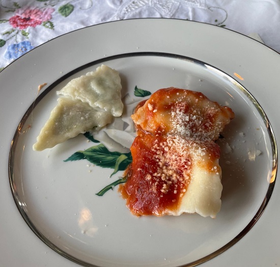 4 Cheese Ravioli with Tomato Sauce – I used my favorite pasta dough, filling – Ricotta, Asiago, Parmesan, Mozzarella, salt and pepper, (I made and put them in the freezer), boiled just before serving, served with my Mom’s homemade tomato sauce. Locatelli cheese garnish. I made 4 cheese filling instead of my normal 2 or 3 cheese to make it special. The family requested that I make 4 cheese all the time now.