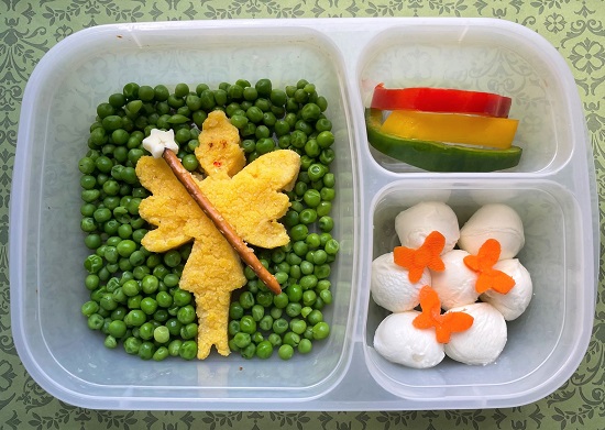 Left Side: Fairy – Polenta cut with a cookie cutter, Eyes – cinnamon attached with a toothpick, Mouth – red food coloring marker, Wand – pretzel stick with Star – cheese cut with a mini cutter, peas