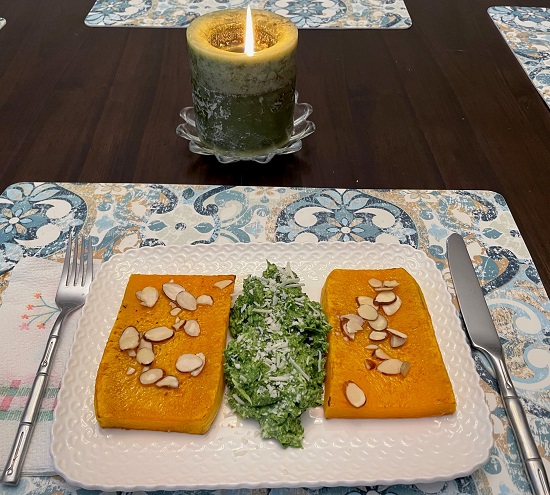 I made this dinner for myself. It was my first time making butternut squash steaks. I enjoyed it and expect to make other versions in my future.